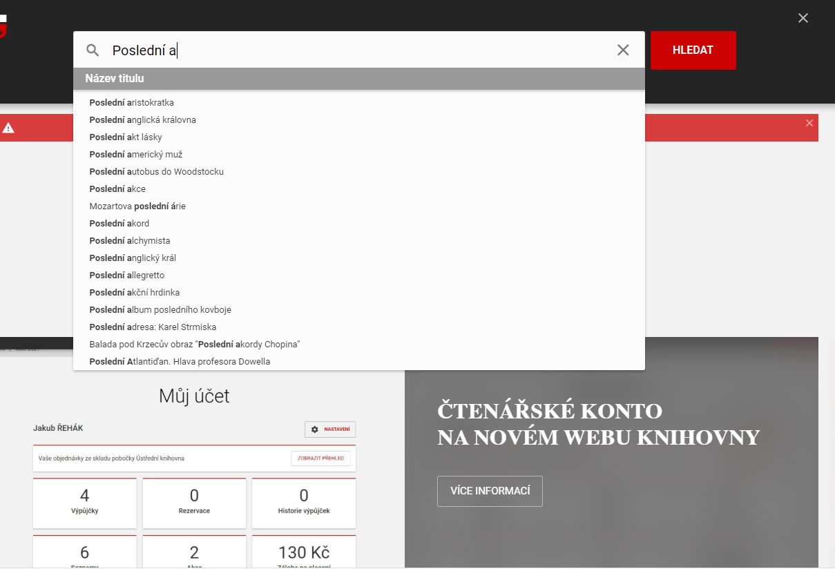 Vyhledávání v katalogu můžete začít kdykoli kliknutím na červené tlačítko Hledat, které se zobrazuje v pravém horním rohu webových stránek. Poté, co na něj kliknete, zobrazí se vám okno vyhledávání, do kterého můžete vepsat váš dotaz. Například název titulu Poslední aristokratka. Katalog vám ihned začne našeptávat možné tituly, a pokud se nápověda shoduje s vaším dotazem, můžete si daný titul vybrat a kliknout na něj. Podobně můžete vyhledávat nejen v názvech titulů, ale také autory, ISBN či klíčová slova.