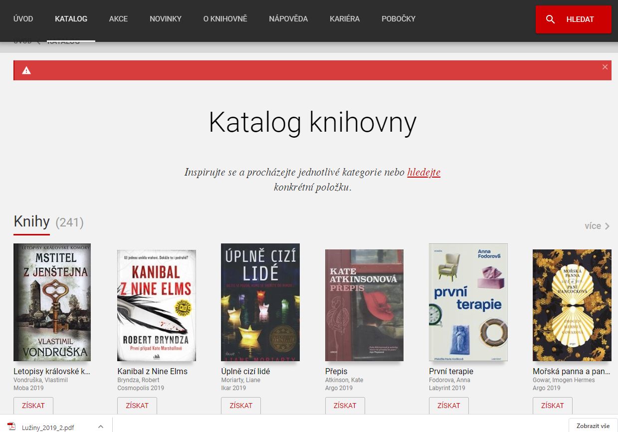 Po kliknutí se vám zobrazí všechny druhy dokumentů, které od daného titulu máme. Pokud si chcete titul půjčit, můžete kliknout na tlačítko „ZÍSKAT“, které se zobrazuje hned pod obrázkem. Bližší informace o titulu se vám zobrazí po kliknutí na obálku knihy. Pokud si chcete titul půjčit, kliknete buď na tlačítko „ZÍSKAT JAKÉKOLIV VYDÁNÍ“ (od titulu máme víc vydání) nebo na tlačítko „ZÍSKAT“ (od titulu máme jedno vydání).