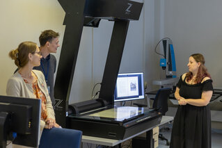 Rozsáhlá kancelář v historické, památkově chráněné budově skrývá ty nejmodernější technologie. Zdejší skenery dokážou za opatrné asistence knihovnic a knihovníků převést stovky let stará díla do elektronických souborů, které pak lze prohlížet kdekoli po světě na mobilu nebo počítači. Digitální podoba je tak kvalitní, že umožňuje zkoumat i samotnou strukturu papíru.
