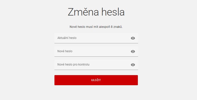 Zobrazí se formulář s nabídkou jednotlivých polí („Aktuální heslo“, „Nové heslo“ a „Nové heslo pro kontrolu“), které je třeba vyplnit. Pozor! Heslo musí obsahovat nejméně 8 znaků. Potom klikněte na tlačítko „ULOŽIT“. Tímto je změna hesla provedena.