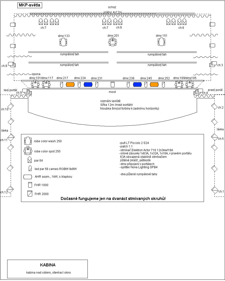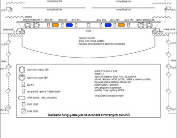 - OSVĚTLENÍ: osvětlovací pult PICOLLO II, max. 32 stmívatelných okruhů, světelný park 12× FHR 1kW zepředu (možnost barevných filtrů), 6×FHR 500W z boků, 3×FHR 1kW ze shora, inteligentní světla 2×Color Wash + 4×ColorSpot 250AT